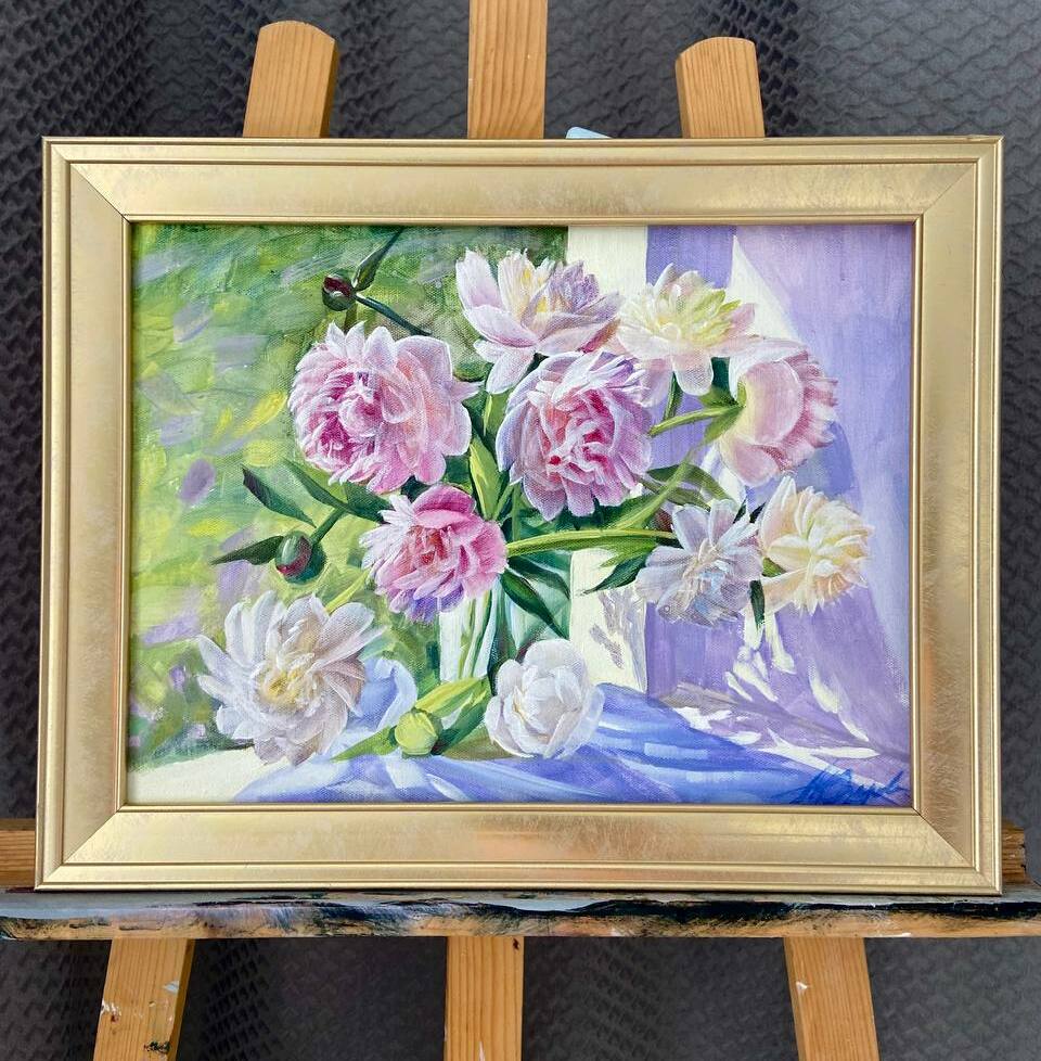 Рисуем классический натюрморт — утренний букет пионов в вазе.